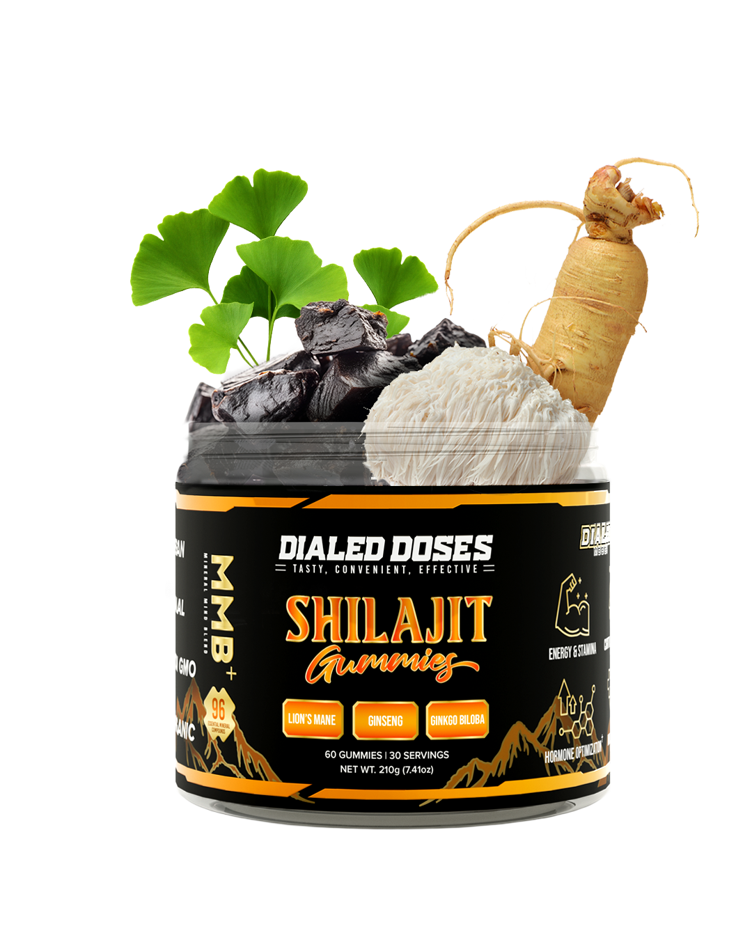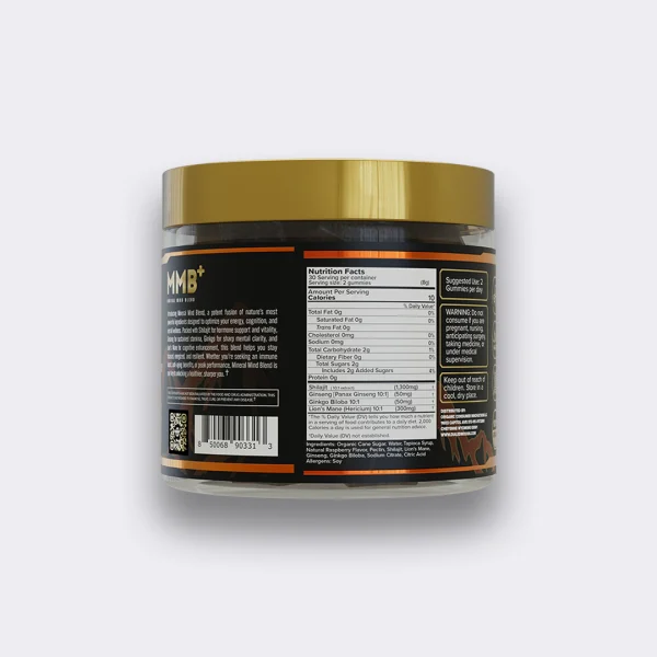 Each serving (2 gummies) contains 1,300mg of premium shilajit, plus 50mg Ginseng, 50mg Ginkgo Biloba, and 300mg Lion's Mane.